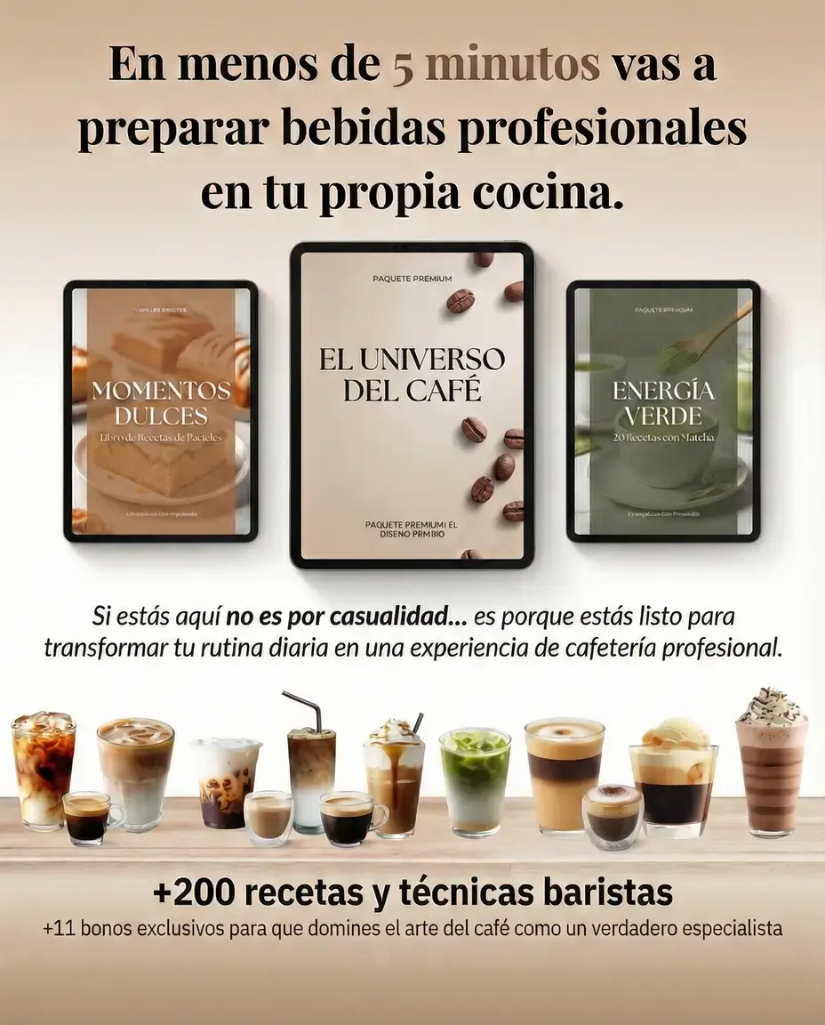 También recibes 3 BONOS ESPECIALES + 8 SÚPER BONOS EXCLUSIVOS creados para profundizar tu experiencia, ampliar tus sabores y convertir cada taza en un verdadero ritual.